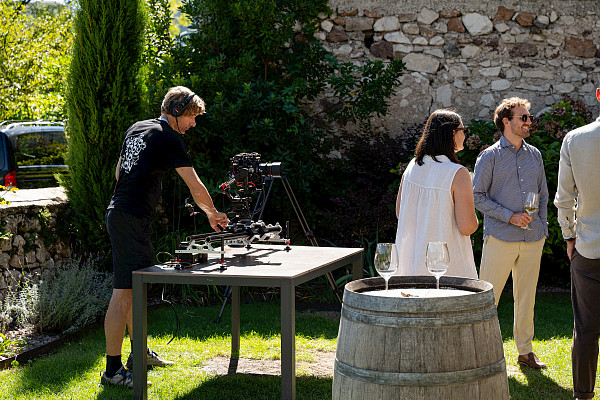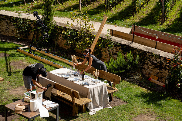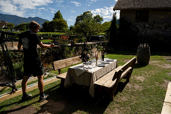 We worked with real people, authentic gestures, and subtle details: hands, glasses, movement. The outdoor table becomes the center of the scene, followed by a calm final shot showing the location – nature, quietness, South Tyrol.